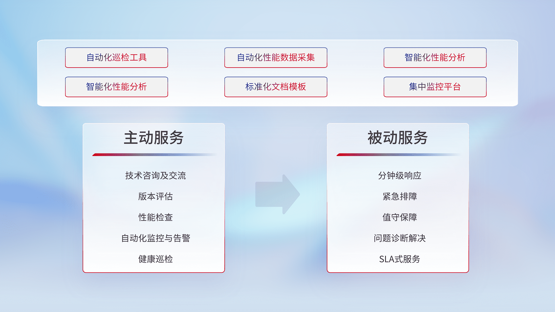 智能化工具和标准化文档,,,保障服务质量,,,,提供主动服务(包含技术咨询、、版本评估、、、、性能检查、、自动化监控与告警、、、健康巡检)和被动服务包含(分钟级响应、、、、紧急排障、、、值守保障、、问题诊断解决、、SLA服务)。。